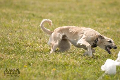 Try your paw at lure coursing - the most fun your dog can have with a plastic bag! Lure coursing is a fast-paced chase sport. Dogs run after a "bunny" lure (a white plastic bag) that is attached to a line. They run in an open field and run as fast or slow as they want. This sport was developed for sight hounds, but many dogs love the thrill of the chase. If your dogs love to chase things, they will LOVE lure coursing! And even if you think they won’t, you might be very surprised when your dogs go nuts for the lure!